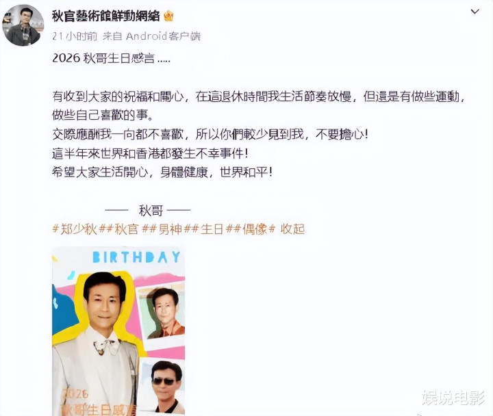 郑少秋频年很少献艺,他照旧79岁了,郑少秋通过其影迷会账号“秋官艺术馆鲜动收罗”在2026年农历诞辰(3月24日)本日发布感言,初次公开回话频年藏隐原因与个东谈主现状 。他照旧退休,收到寰球的祝贺和抖擞,在退休时刻里会把活命节拍延缓,但如故有作念些敞开,作念些我方心爱的事。