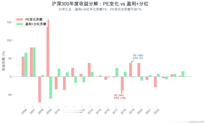 我把沪深300每一年的收益拆成了两部分:PE估值的变化,和企业盈利的增长。