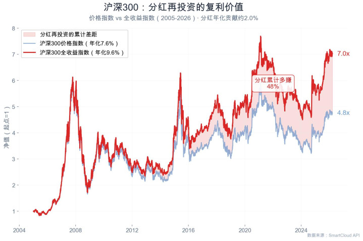 图里两条线是雷同的沪深300指数,红线是全收益(分成自动买回),蓝线是价钱(分成非论)。中间红色区域等于分成再投资累计多赚的部分。