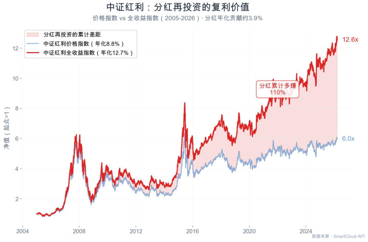 雷同的21年,中证红利全收益指数年化12.7%,1万元造成了12.6万。价钱指数6.0万。红色区域比沪深300那张大了一倍多,分成累计多赚了110%。
