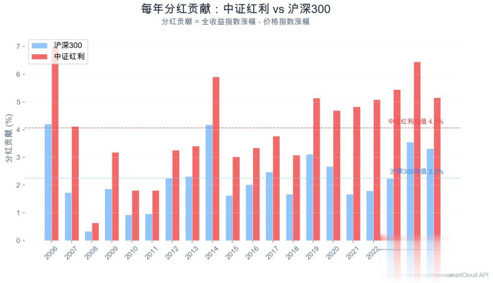 间隔看每年,沪深300分成平均孝敬2.2%,中证红利4.1%,差未几是两倍。近五年差距更大,中证红利年均5.4%,IM体育沪深300唯有2.5%,多出快要3个百分点。