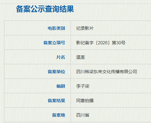 3月31日,据国度电影局备案公示查询效力,由李子柒编剧的电影《温室》已备案,类别为记载影片,备案单元为四川秭柒东来文化传播有限公司。