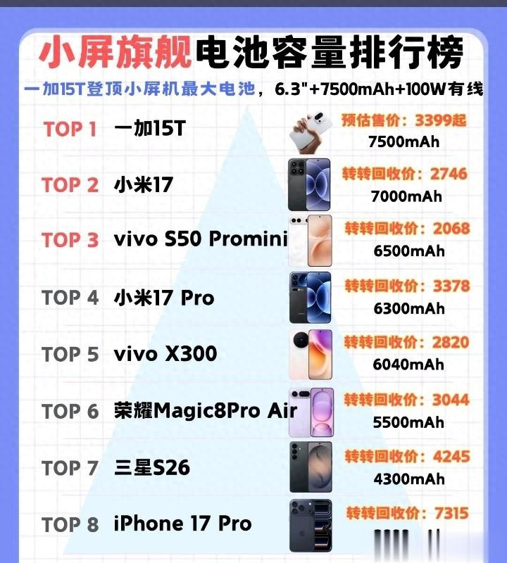 2026年3月31日,一份对于小屏旗舰手机电板容量的名次榜在数码圈激发了庸俗怜惜。这份榜单详备列出了面前市集上主流小屏机型的电板规格,为那些追求便携性与长续航兼得的消耗者提供了首要的参考依据。在这份榜单中,一加15T凭借其惊东谈主的7500mAh电板容量,毫无悬念地登顶榜首,成为了现时小屏手机中当之无愧的续航王者。