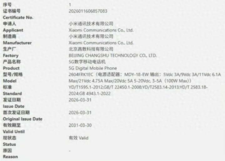 3C认证文凭 · 小米5G数字移动电话机3C认证信息