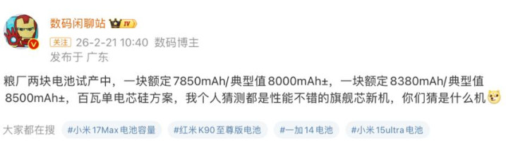 微博截图 · 数码博主爆料小米大电板新机信息