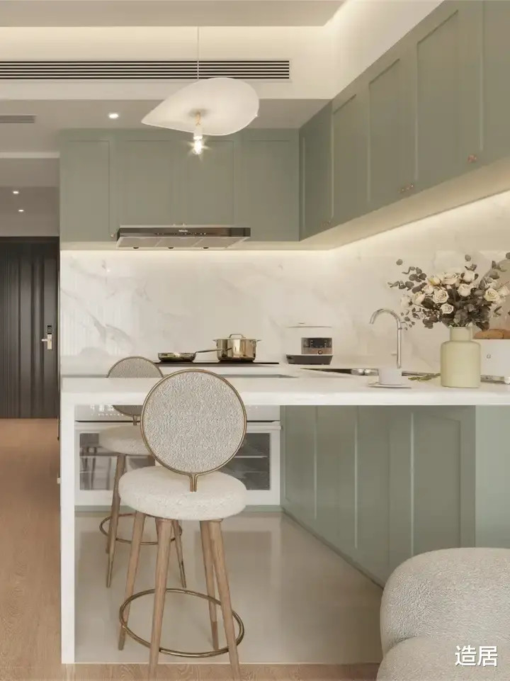 L型厨房:应用拐角作念凹凸落差,长边作念水槽+切菜高台面,短边作念灶台区低台面,拐角处作念弧形过渡,幸免磕碰,还能最大化应用空间,适配绝大多量小户型。