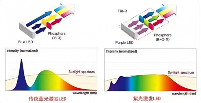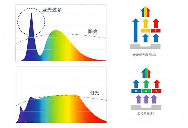 是以从意见就可以发现,全光谱的门槛并不高,当今咱们能看到的护眼灯齐是全光谱的,然则他们的全光谱其实是存在分离的,关节照旧要看具体的光源工夫和光谱结构缱绻。目下市面上比较常见的主要有两种情势:一种是蓝光激励,另一种是紫光激励。