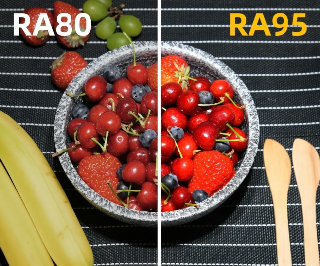 显色指数其实亦然好多东说念主比较温暖的一个参数。绵薄来说,显色指数Ra值越高,越接近100,物体的表情规复度就越接近真实。比如看书册插图、画画或者作念手工的时候,高显色的灯看起来会更天然一些。