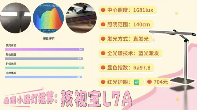 孩视宝L7A的光源面直径有58cm,按意念念来说可以袒护的范围比较广,不外因为它弃取的是直发光情势,举座的光辉比较有计划,是以最终是能袒护140cm的书桌。不外它的中心照度有1700lux,举座桌面的亮度相对比较高,亮度比较满盈。同期它是弃取了高下发光的情势,灯头上方有漫射补光的两个小发光面,可以在一定进度上平衡下环境的明暗差。从光谱来说,发扬也比较平衡,中规中矩。